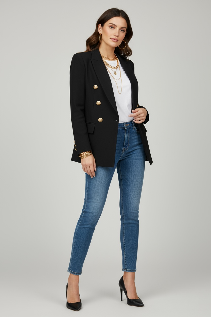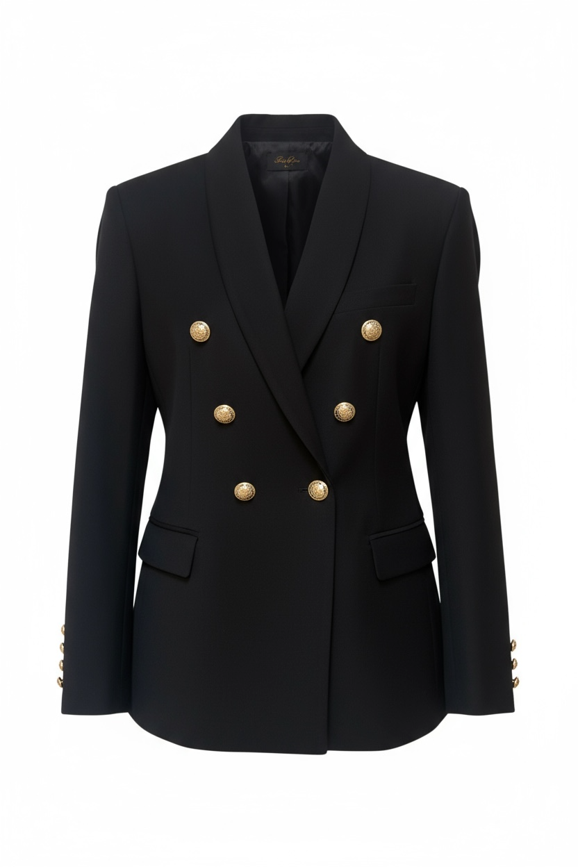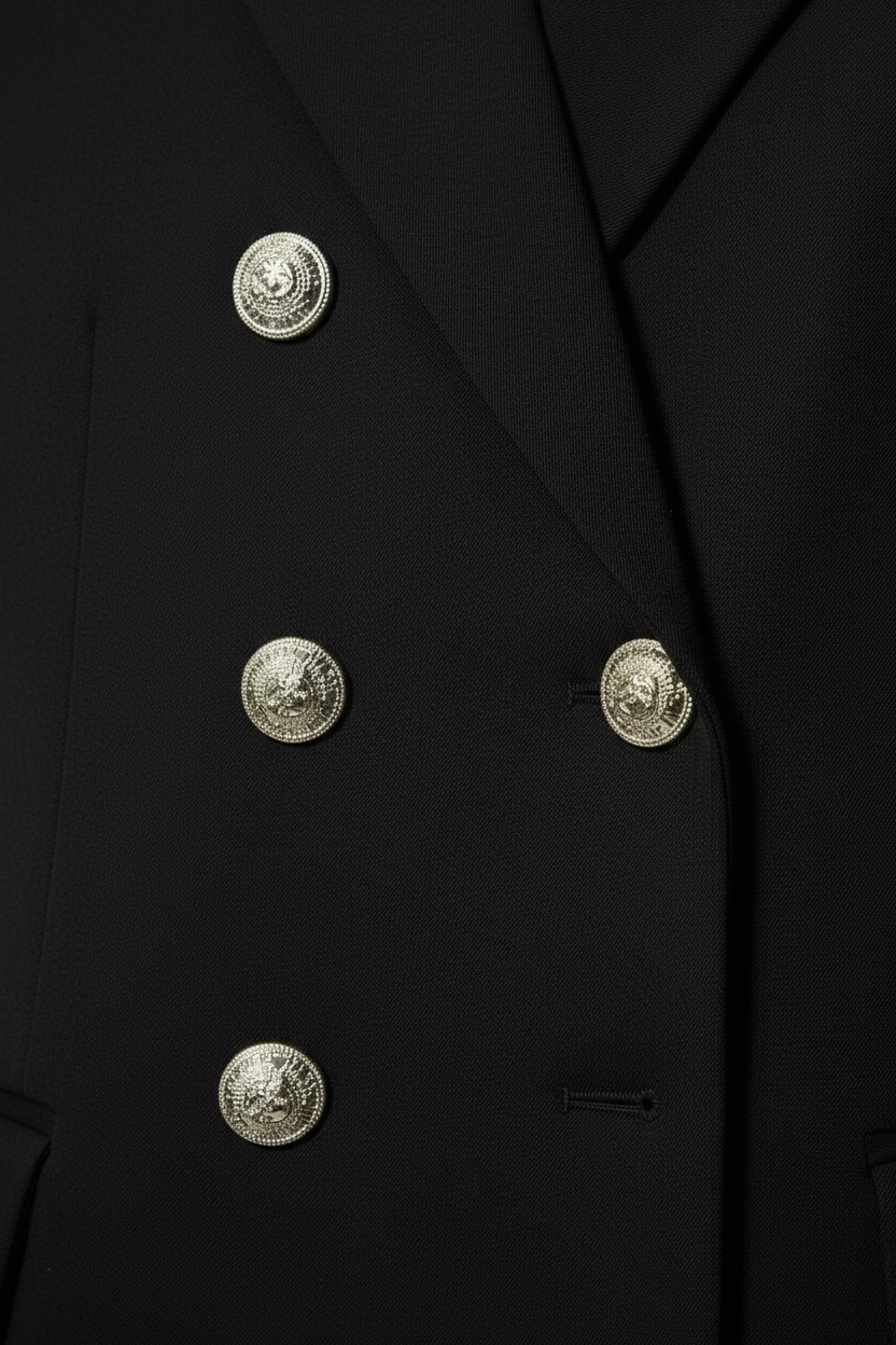 • Double boutonnage doré : Des boutons dorés brillants qui ajoutent une touche de luxe et de distinction.