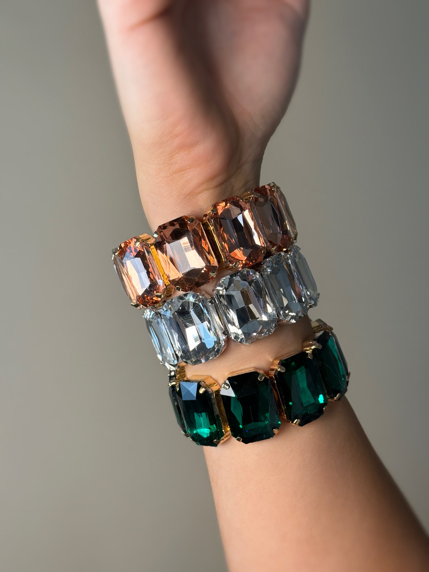 Affirmez votre style avec audace grâce à ce somptueux bracelet composé de grands cristaux facettés. Véritable bijou d’apparat, il capte la lumière avec intensité et habille le poignet d’un éclat spectaculaire. Disponible en plusieurs teintes précieuses — vert émeraude profond, champagne lumineux, ou cristal transparent éclatant — ce bracelet incarne à la fois l’élégance et le caractère. Chaque pierre est montée sur une base souple et extensible, pour un confort optimal sans compromettre l’effet “wow”.