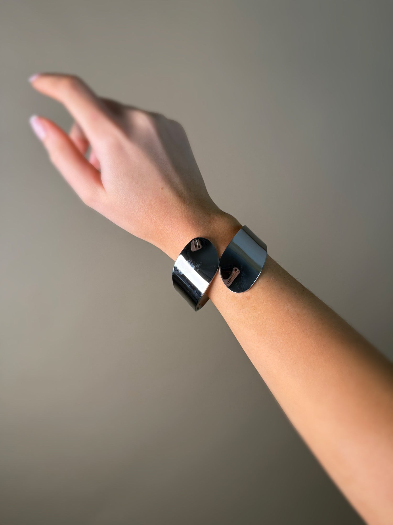 Ce bracelet est conçu en métal léger et résistant, poli à la main pour un rendu ultra brillant. Sa forme rigide et ouverte permet une mise en place facile et un ajustement confortable sur la majorité des poignets. Les finitions sont soigneusement travaillées pour éviter toute gêne au porté. C’est un bijou à la fois intemporel et avant-gardiste, pensé pour durer dans votre collection.