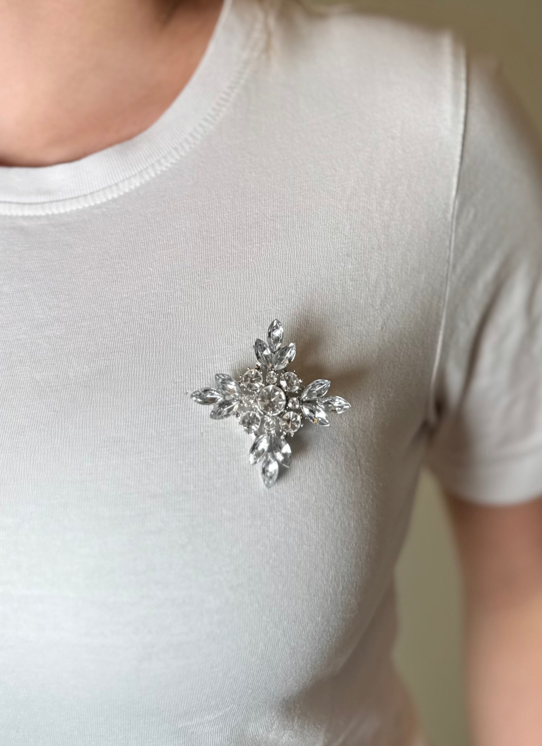 Broche décorative montée sur une base métallique. Fermoir à clip sécurisé au dos pour une fixation facile sur différents supports. Ornement incrusté de détails brillants pour un fini soigné et raffiné.