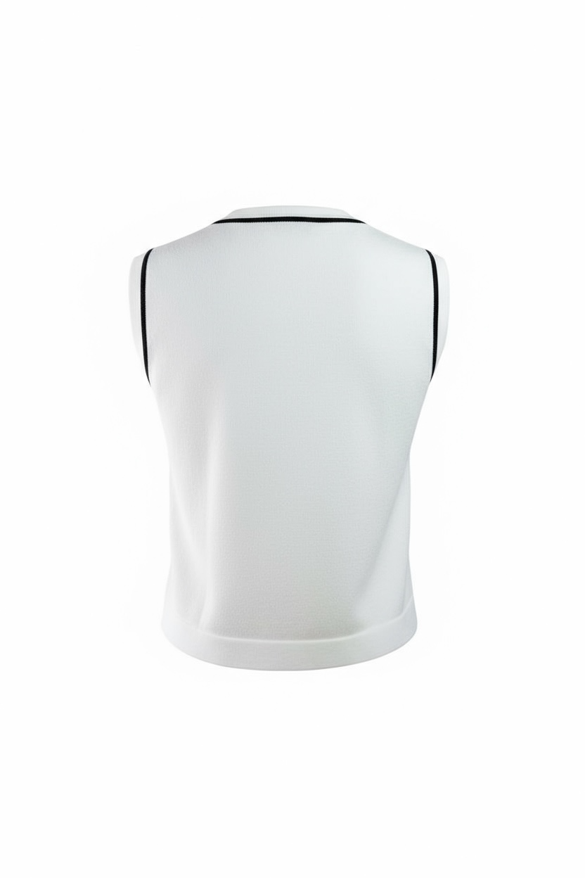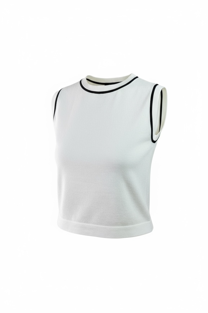 Élégant et minimaliste, ce débardeur revisite les essentiels du dressing avec une touche subtile d’originalité. Sa coupe ajustée épouse délicatement la silhouette, tandis que son col rond orné d’une bande ajoute une note sophistiquée et moderne.
