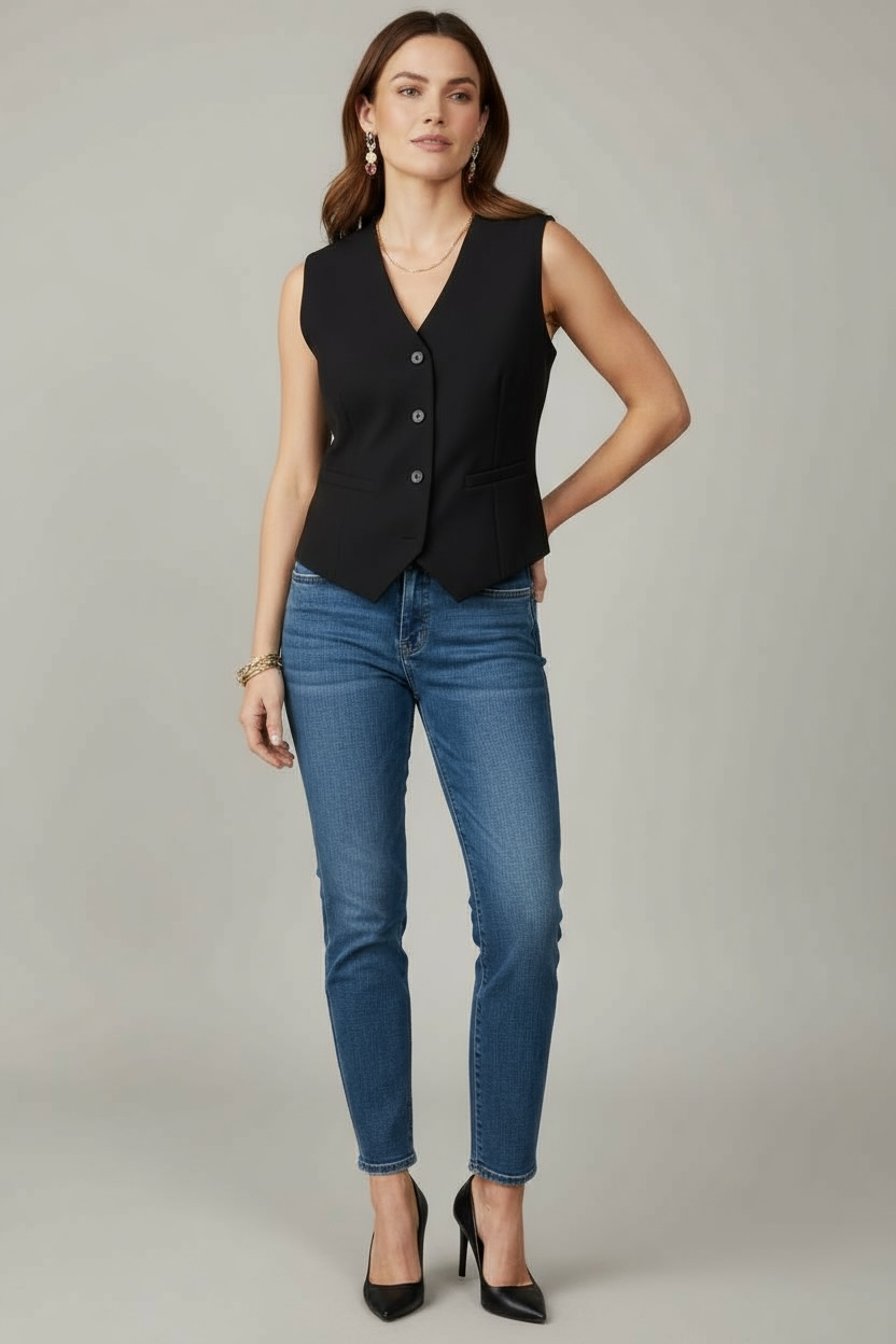 Une pièce intemporelle inspirée du costume trois-pièces, réinterprétée avec une touche de modernité et de féminité. Ce gilet sans manche noir est un véritable atout mode : chic, structuré et incroyablement polyvalent.