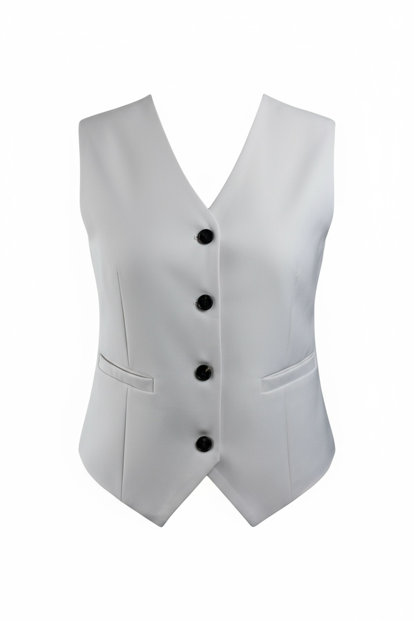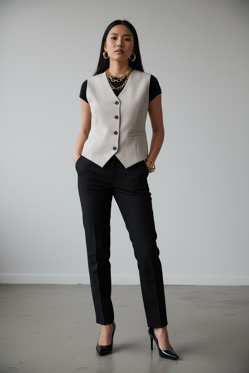 Une pièce intemporelle inspirée du costume trois-pièces, réinterprétée avec une touche de modernité et de féminité. Ce gilet sans manche noir est un véritable atout mode : chic, structuré et incroyablement polyvalent.