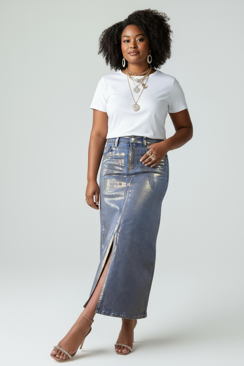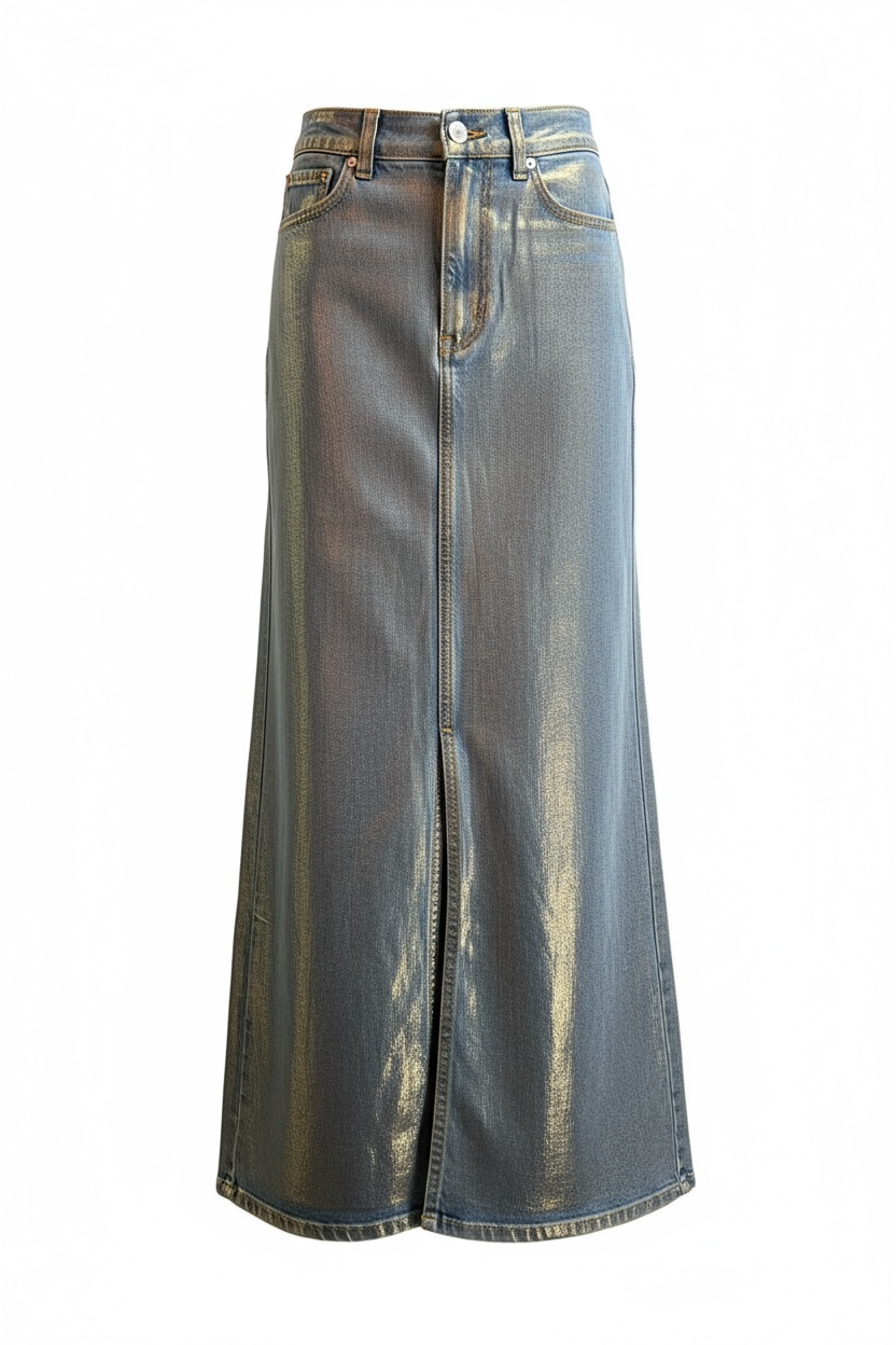 Une pièce forte qui ne passe pas inaperçue ! Cette jupe en jean longue bleu enduit doré allie élégance et audace, pour celles qui veulent un look à la fois moderne et sophistiqué. Sa coupe flatteuse et ses détails bien pensés en font un indispensable du dressing pointu.