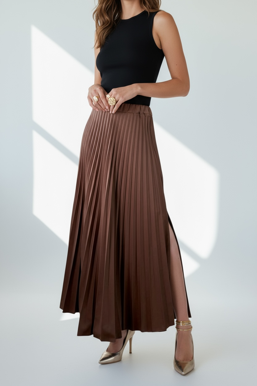 Une pièce sophistiquée et fluide qui sublime chaque mouvement avec grâce. Cette jupe longue plissée marron est l’alliance parfaite entre raffinement et confort, idéale pour un look chic sans effort.