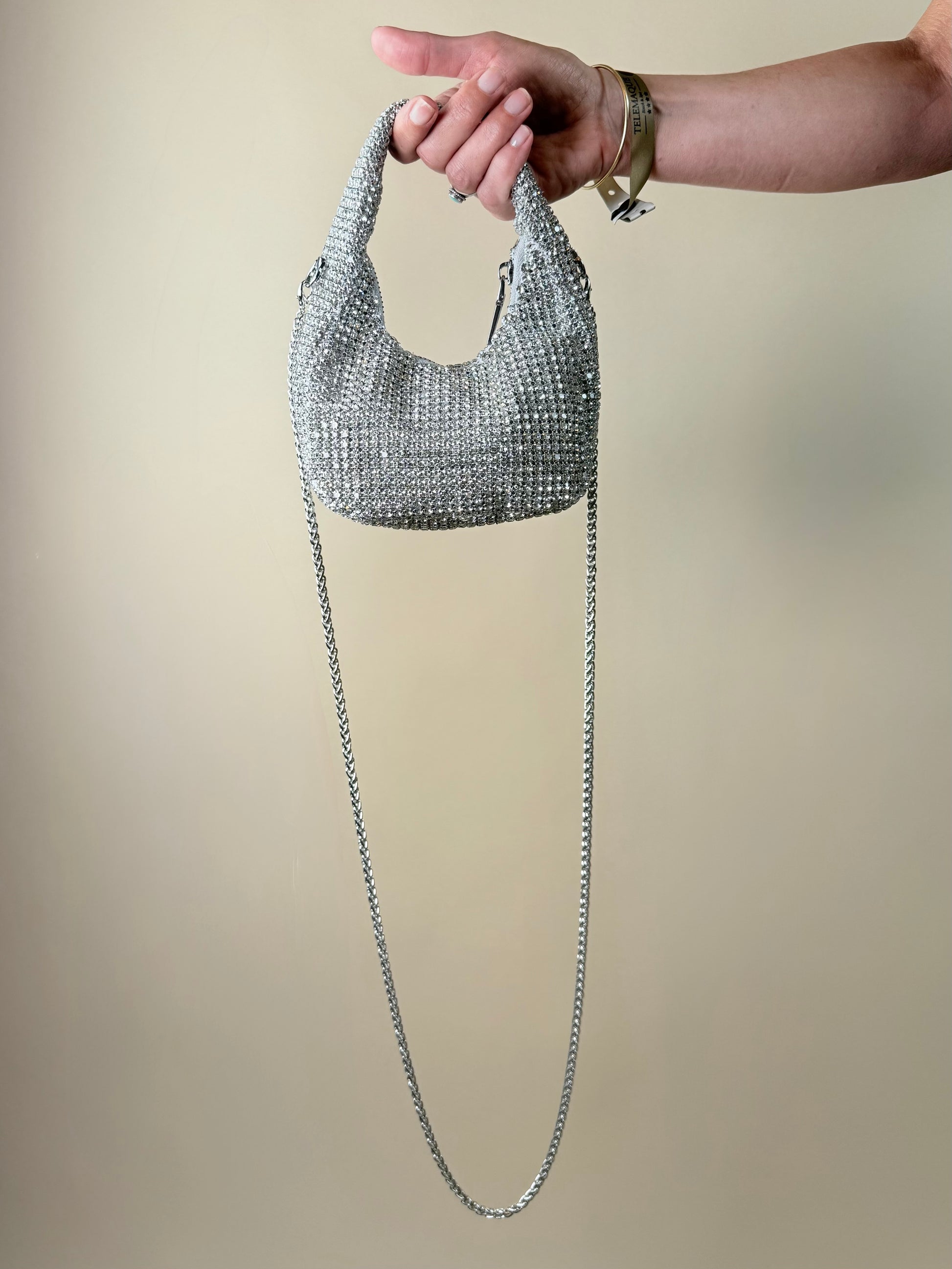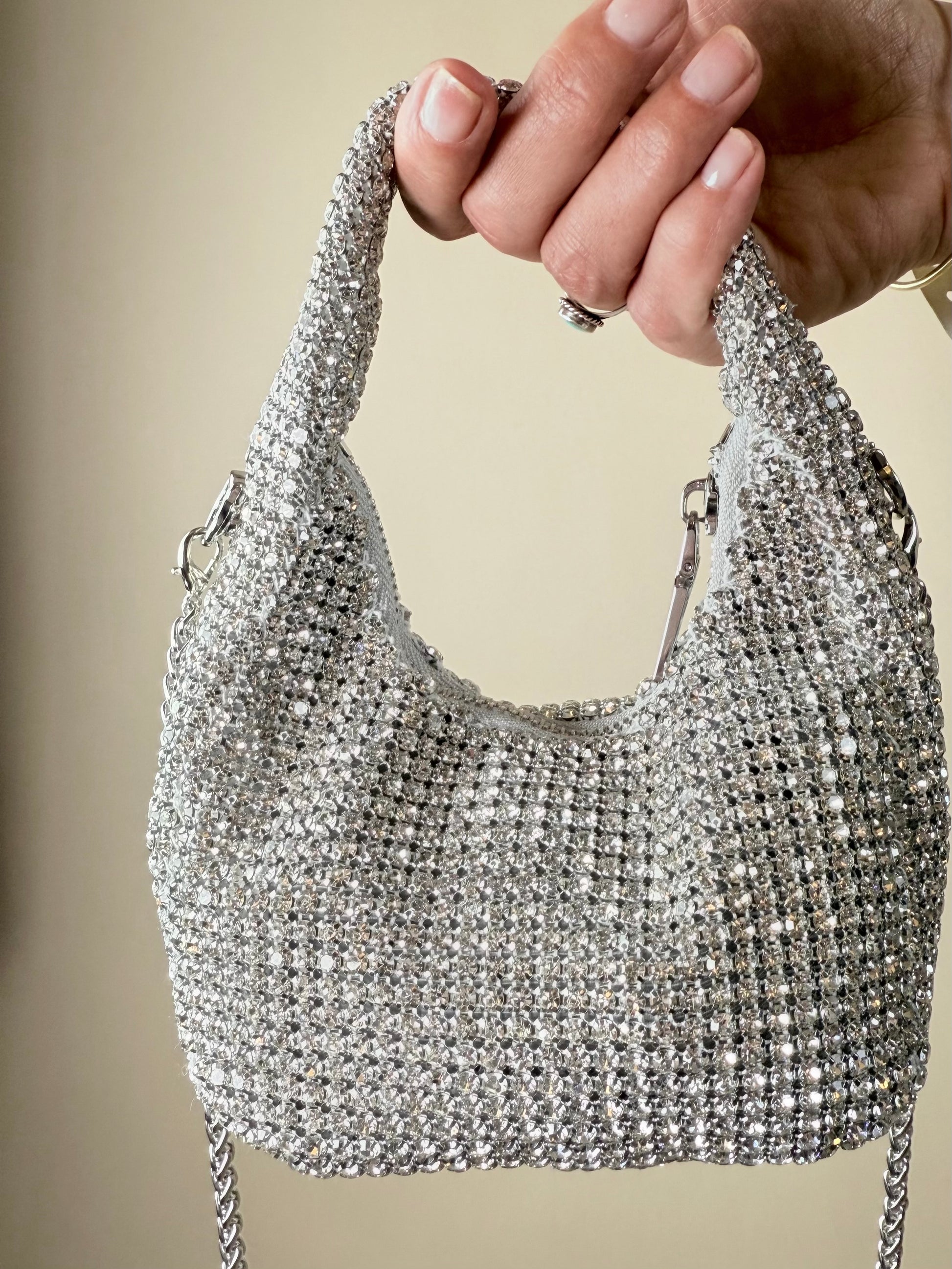 Ce sac est confectionné dans une matière souple recouverte de strass argentés étincelants. Il se ferme par une fermeture zippée discrète sur le dessus. À l’intérieur, on retrouve une doublure textile unie. La bandoulière en chaîne argentée, fine et amovible, permet de le porter à l’épaule ou croisé. Le format est parfait pour contenir téléphone, porte-cartes, clés et rouge à lèvres.