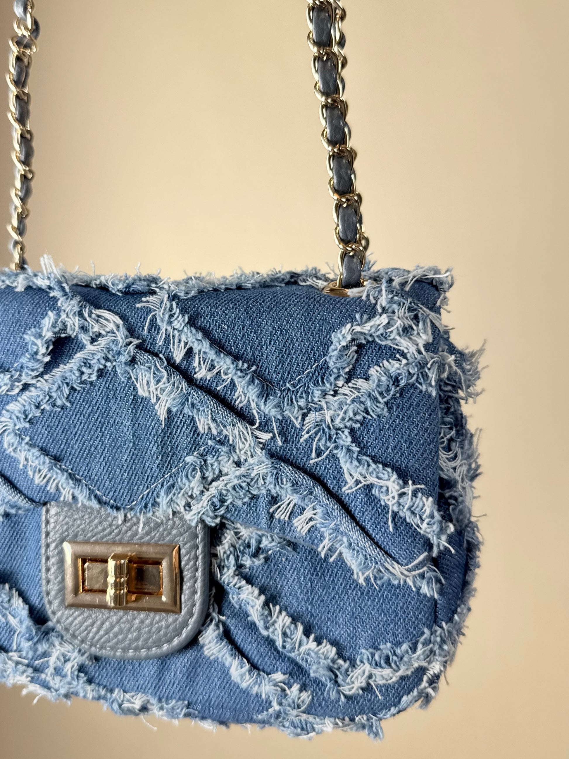 On adore son mix de matières : le denim brut rehaussé de coutures effilochées donne du caractère, tandis que la chaîne entrelacée et le fermoir doré ajoutent une note précieuse. C’est la pièce parfaite pour donner du style à une silhouette simple.