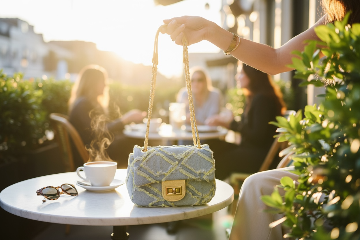 Ajoutez une touche audacieuse et originale à votre tenue avec ce sac à main unique en denim bleu orné d’un motif en losanges frangés vert pastel. Confectionné à partir de denim doux, il arbore un rabat à fermoir métallique de couleur dorée et crème, pour un style à la fois moderne et rétro. Sa bandoulière en chaîne dorée, agrémentée de détails en cuir jaune, ajoute une élégance intemporelle tout en restant pratique à porter. Ce sac polyvalent s’accordera parfaitement à vos looks décontractés ou à vos tenues plus sophistiquées.